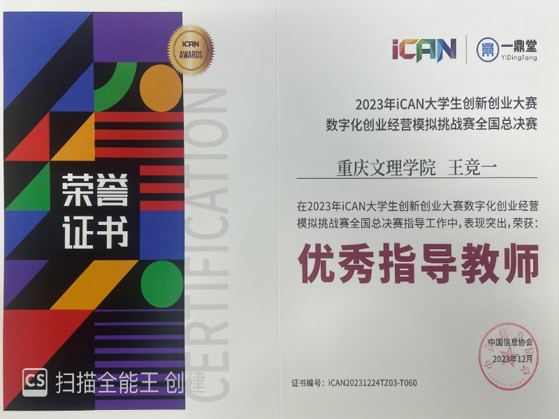 2023年iCAN大学生创新创业大赛数字化创业经营模拟挑战赛以数字化创业经营为主题,将创新创业与数字化技术相结合,参赛团队需在模拟环境中进行创业策划、团队组建、运营管理、市场竞争等环节的实践操作。 大赛分为校赛、区域赛、国赛初赛、国赛总决赛四个阶段,共吸引了全国1500多所高校6000多支队伍近17万人报名参加,经过各环节的层层选拔,最终遴选出109支队伍进入全国总决赛。经过激烈角逐,我院清雪队、领头羊队两个学生团队分获总决赛一等奖和二等奖,指导教师王竞一获得“优秀指导老师”称号,充分展示了我院学生扎实的专业知识和良好的综合能力。